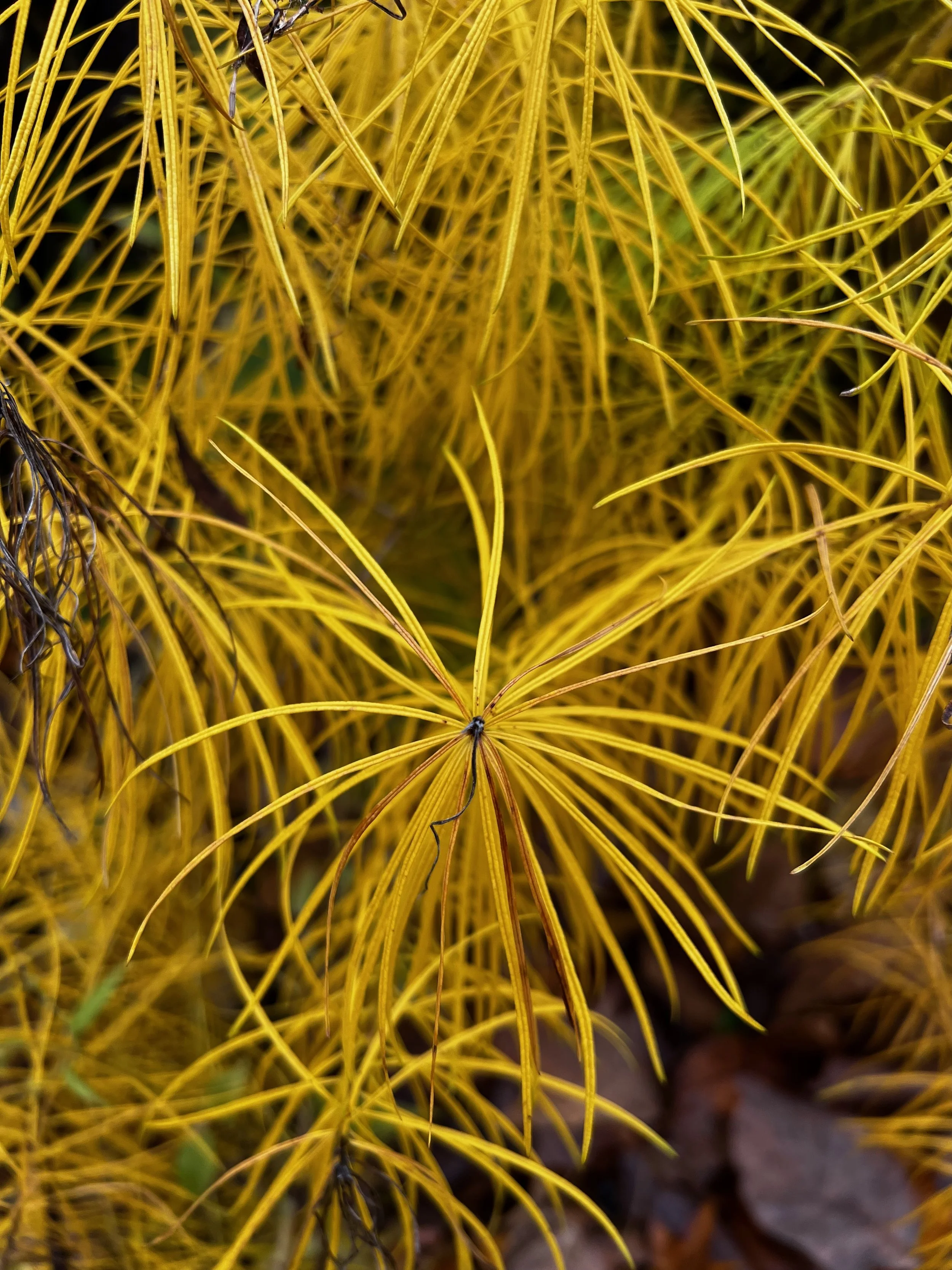 Feathery foliage turns bright yellow in fall.